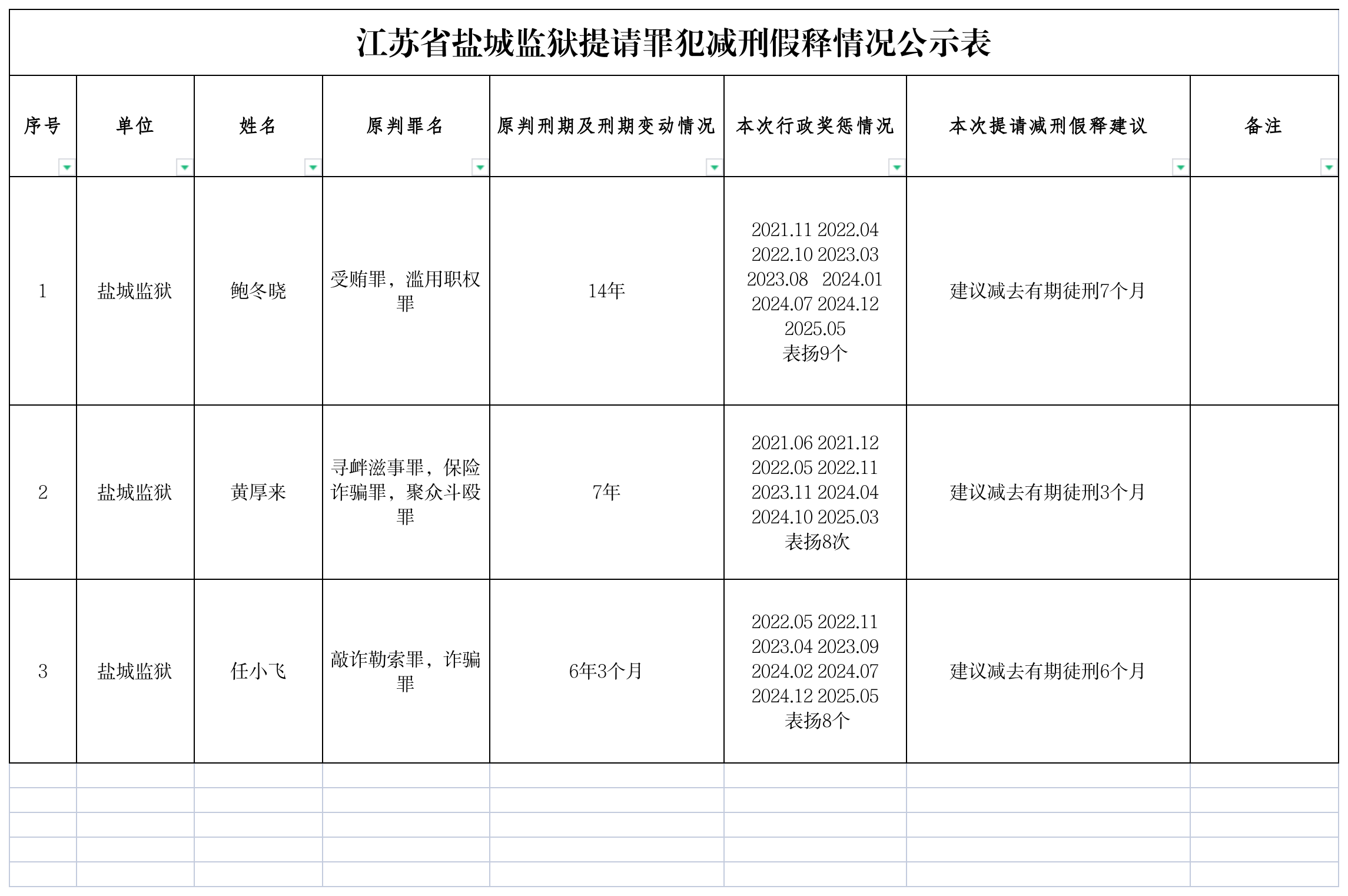 江苏省盐城监狱提请罪犯减刑假释情况公示表