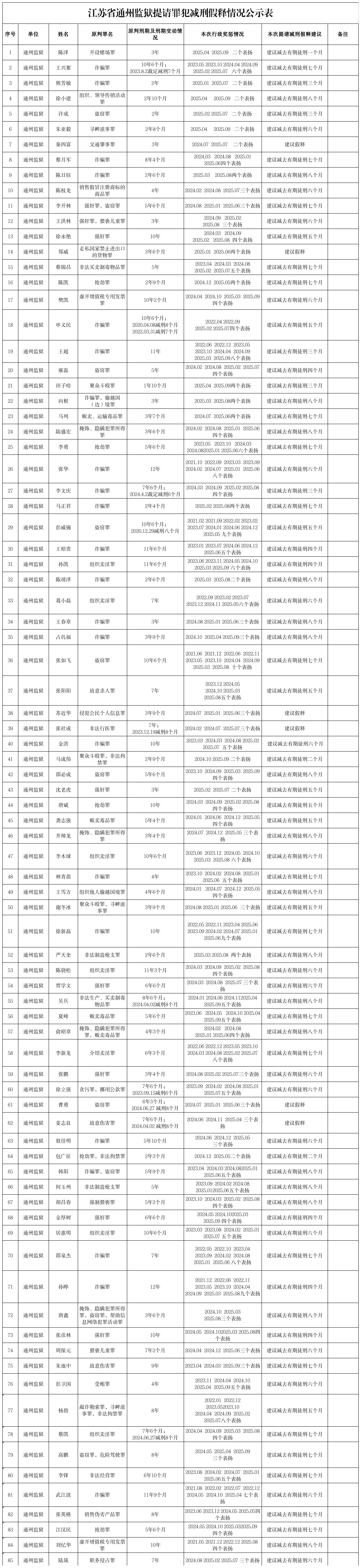 江苏省通州监狱提请罪犯减刑假释情况公示表