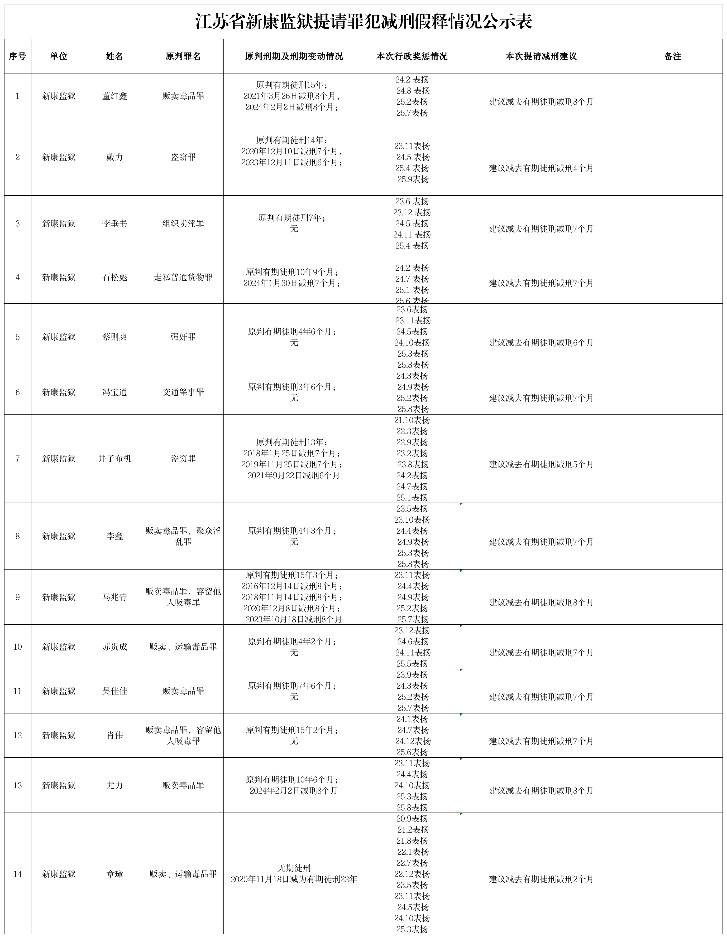 江苏省新康监狱提请罪犯减刑假释情况公示表