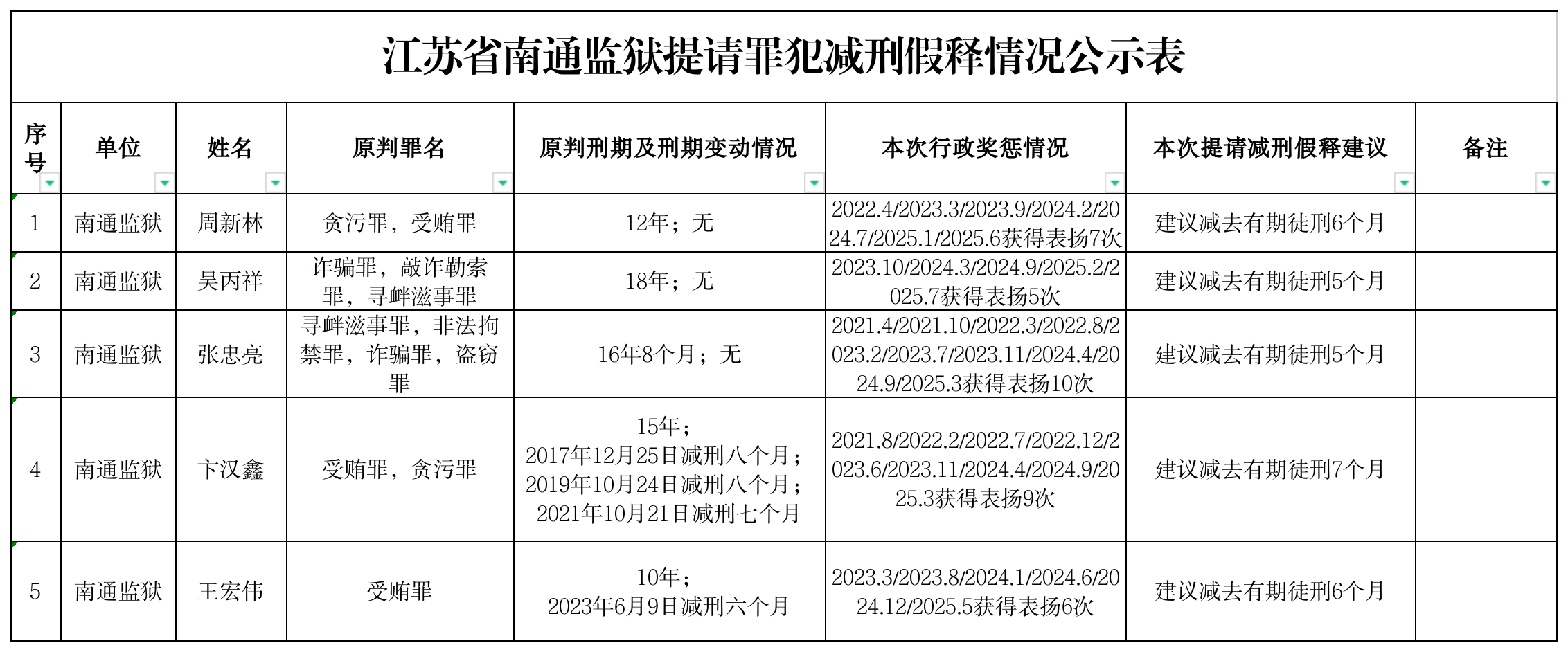 江苏省南通监狱提请罪犯减刑假释情况公示表