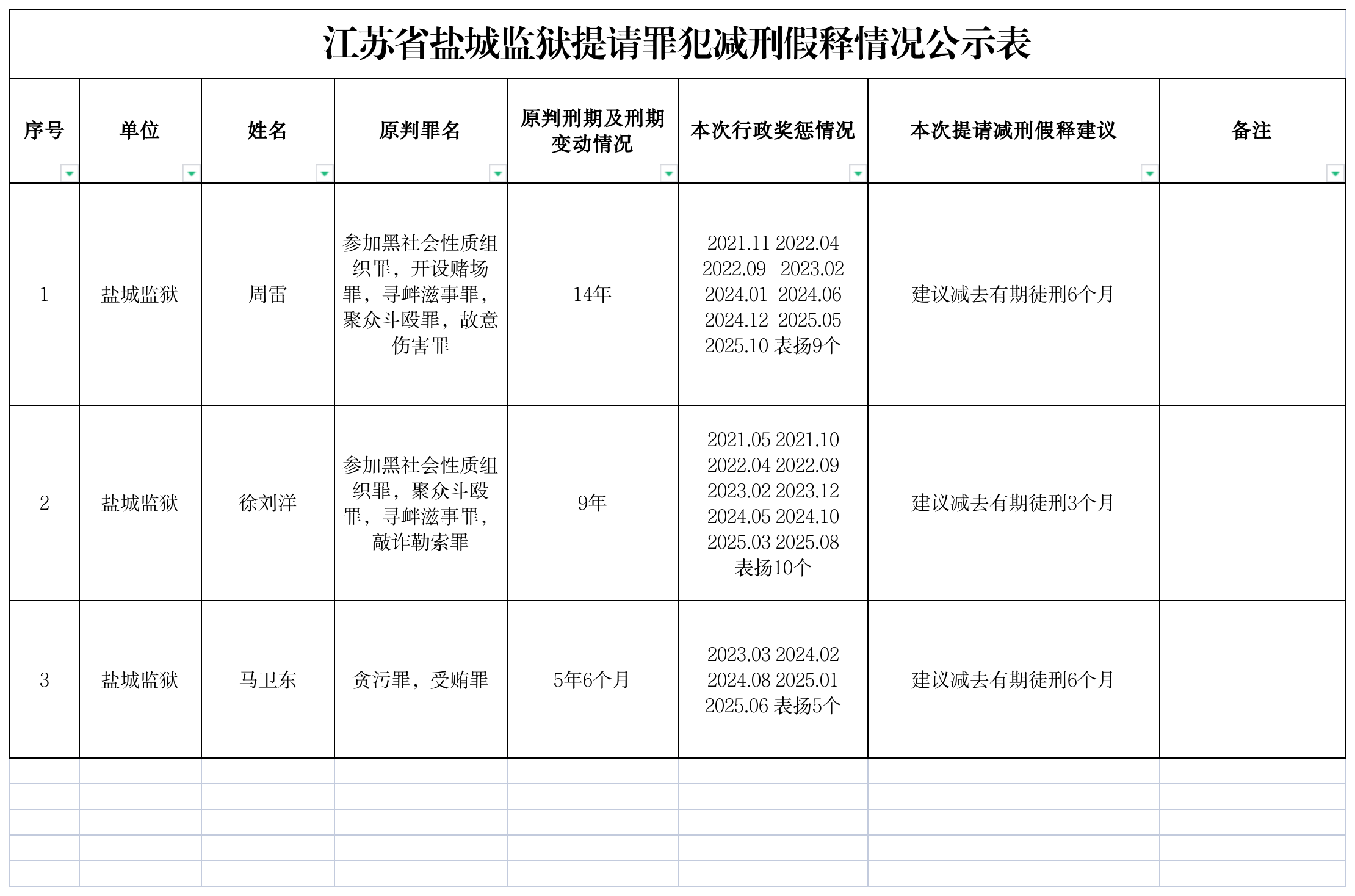 江苏省盐城监狱提请罪犯减刑假释情况公示表
