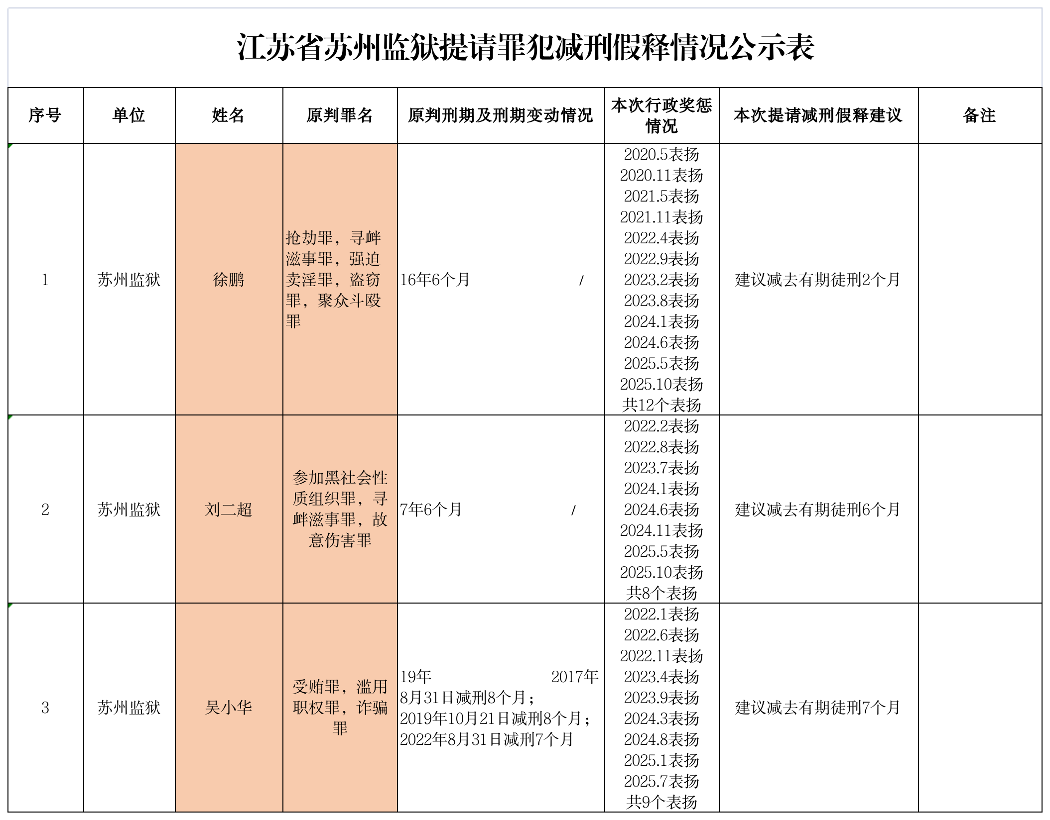 江苏省苏州监狱提请罪犯减刑假释情况公示表